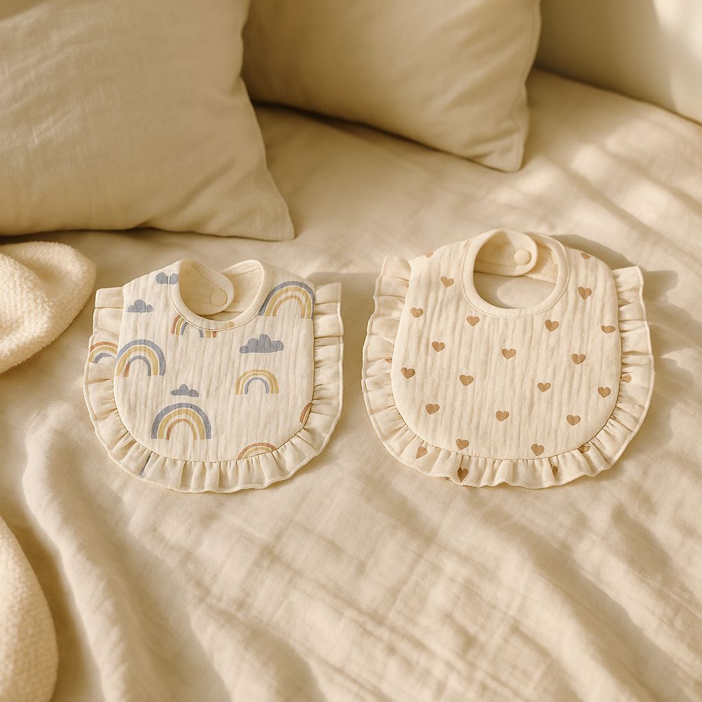 Notre bavoir avec sa bordure à volants décoratifs ajoute une touche d'élégance qui transforme ce simple accessoire en véritable complément de tenue. Les motifs variés comme les oursons, arcs-en-ciel ou pois discrets apportent une dimension ludique et attachante.